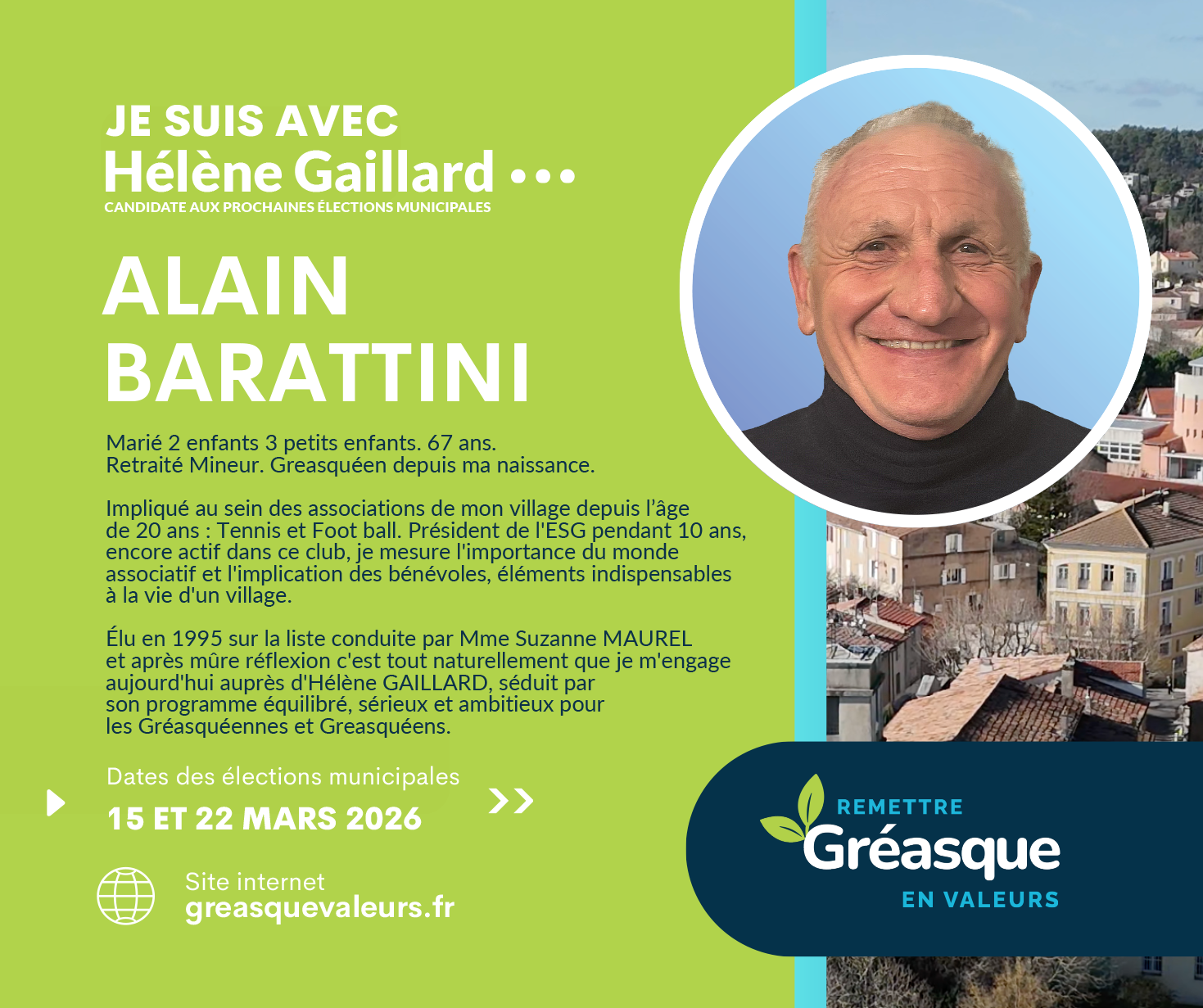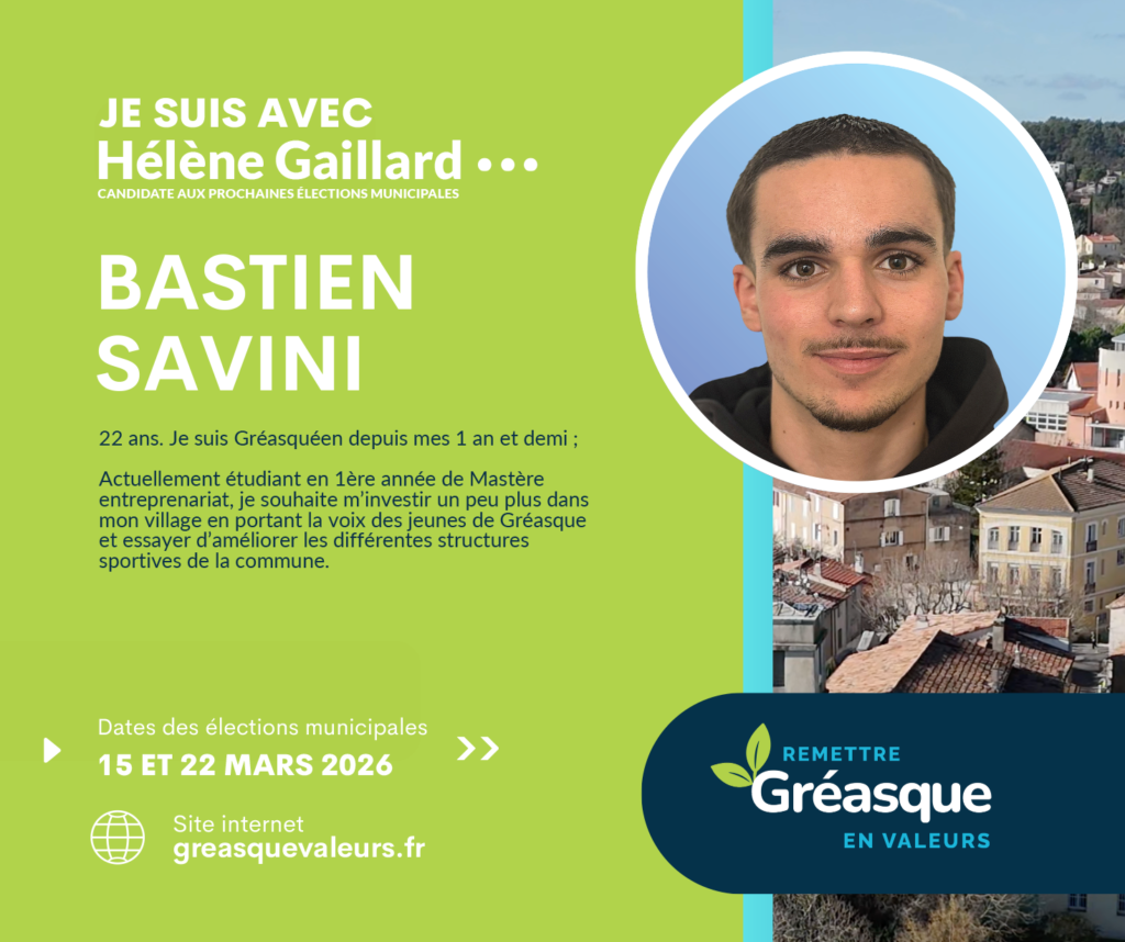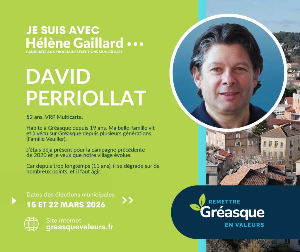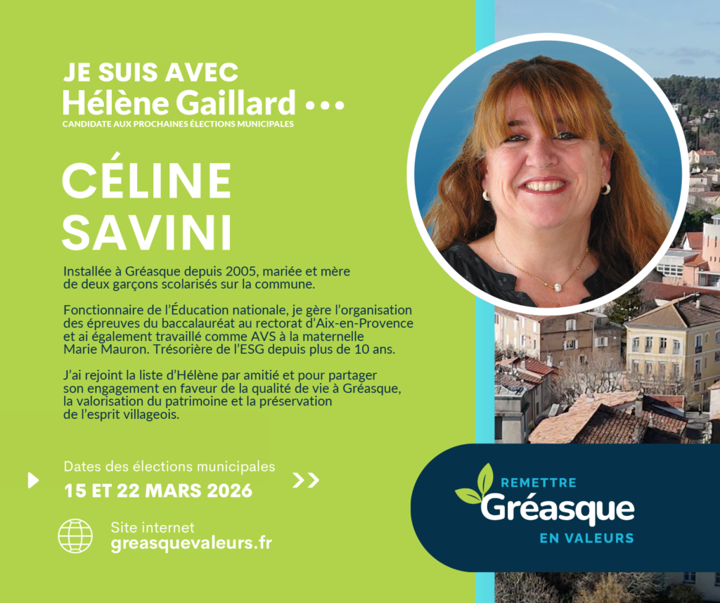 Je crois profondément en Hélène, candidate à la mairie : une personne sincère, investie et à l’écoute. À ses côtés, je souhaite continuer à servir Gréasque, avec sérieux, bienveillance et sens des responsabilités, afin de préserver ce qui fait la richesse et l’âme de notre village.