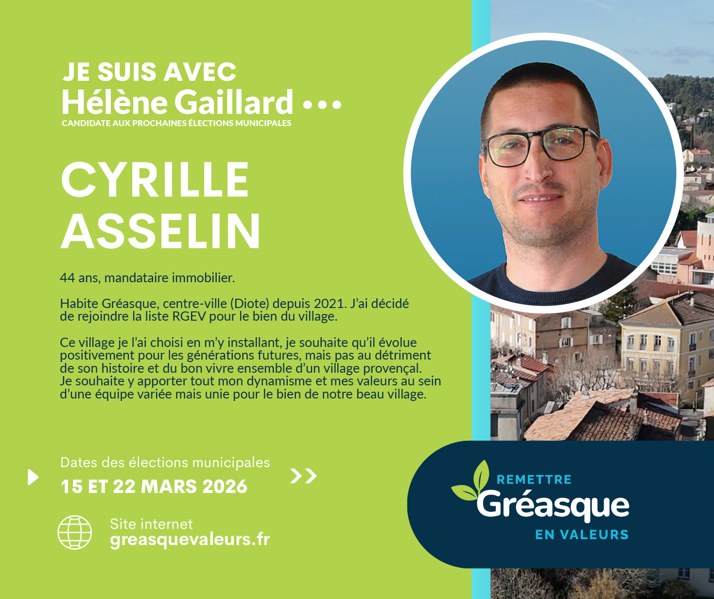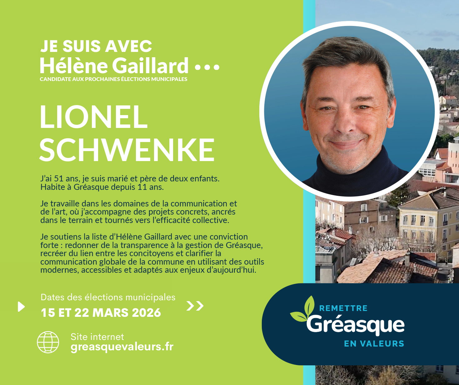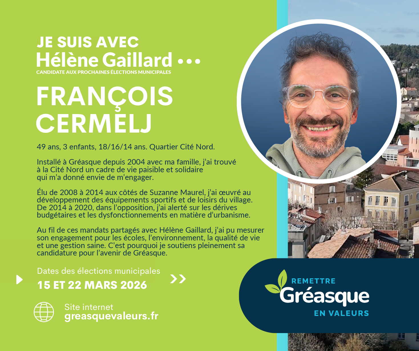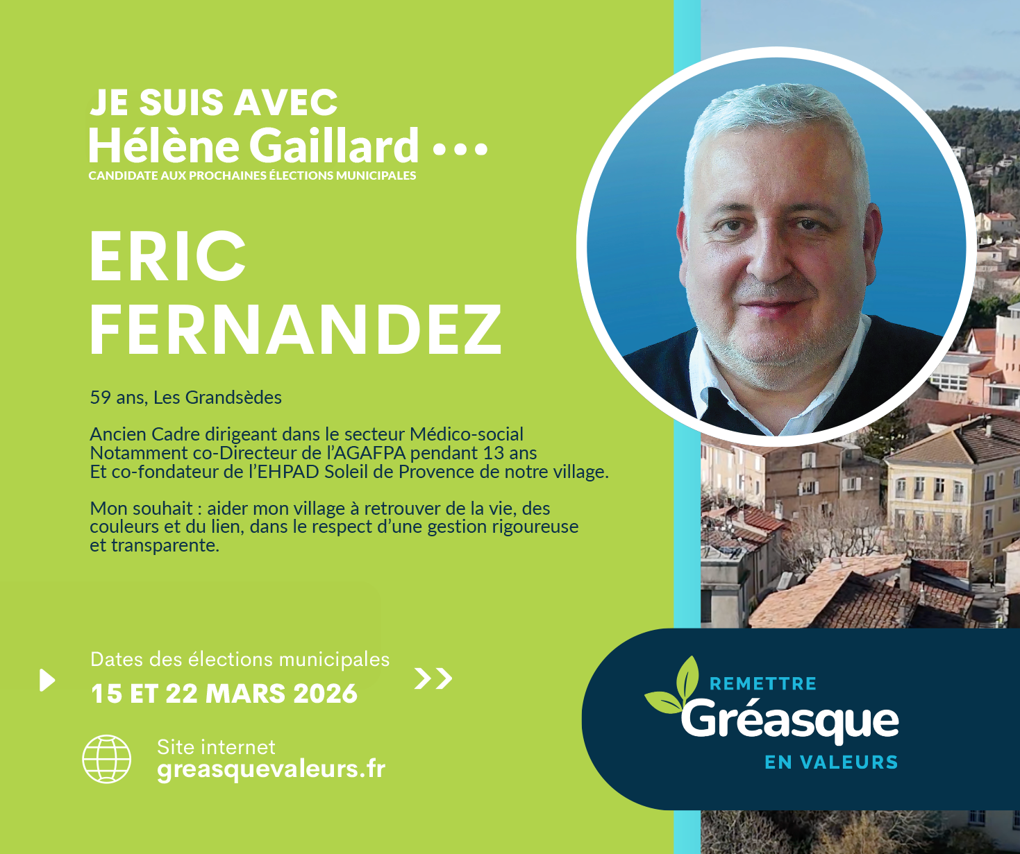 Je crois profondément en Hélène, candidate à la mairie : une personne sincère, investie et à l’écoute. À ses côtés, je souhaite continuer à servir Gréasque, avec sérieux, bienveillance et sens des responsabilités, afin de préserver ce qui fait la richesse et l’âme de notre village.
