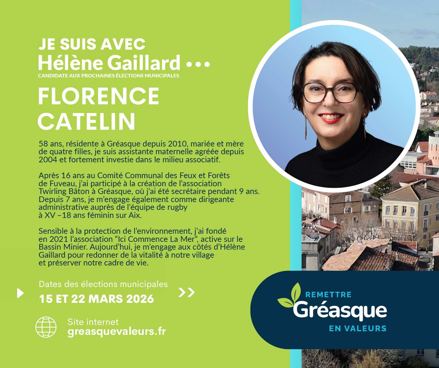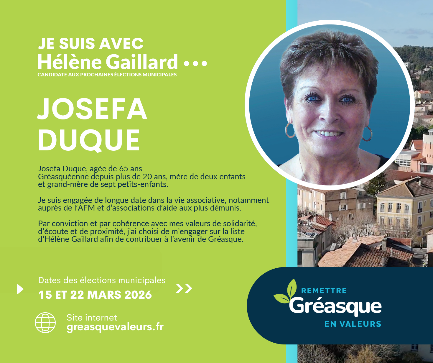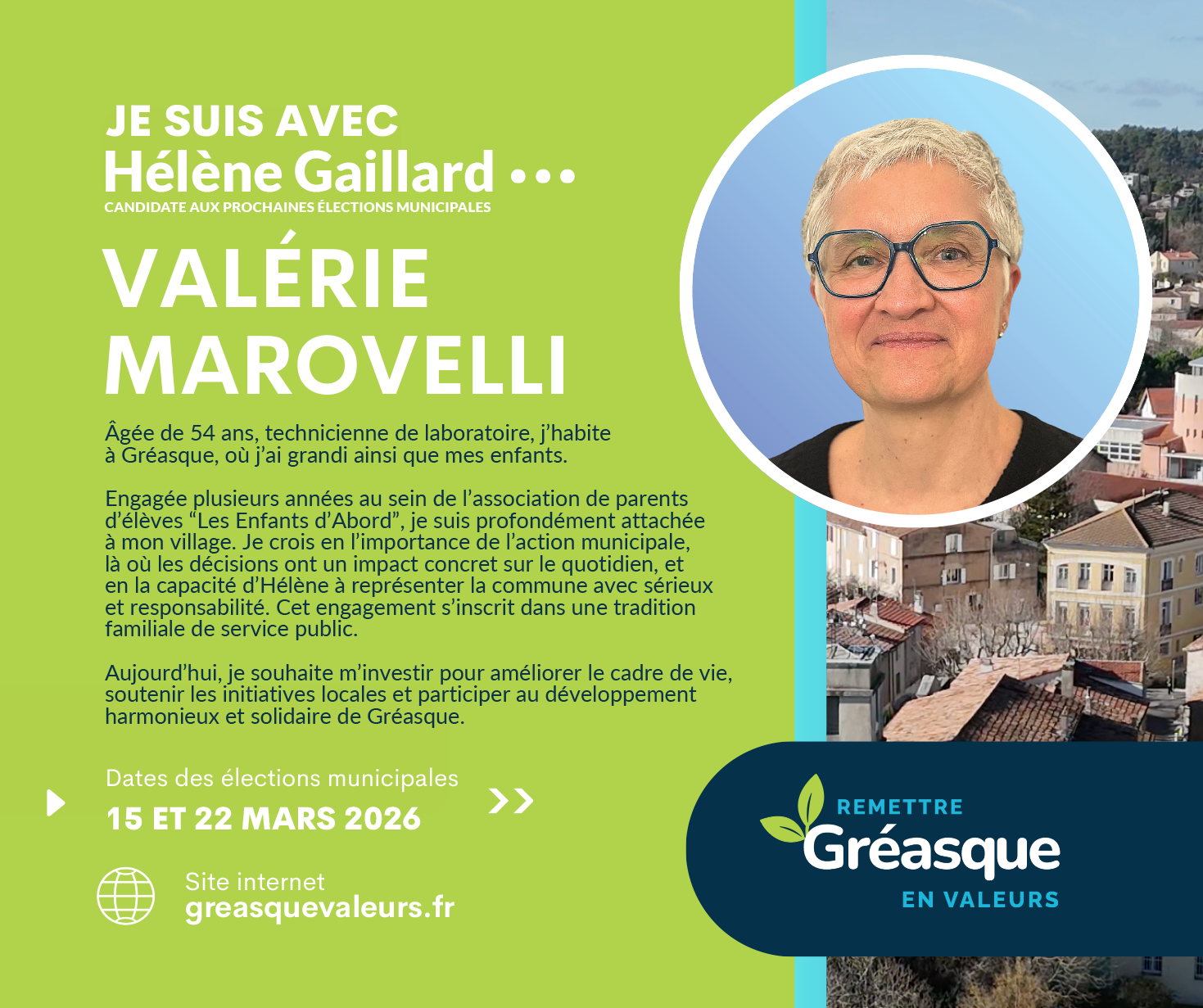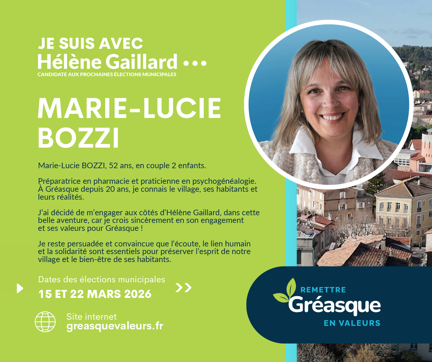 Engagée, bienveillante et solidaire, je souhaite m’impliquer davantage pour valoriser Gréasque et sécuriser l’avenir de nos enfants. C’est pourquoi je soutiens Hélène Gaillard, une femme de valeurs et d’engagement au service de notre commune.