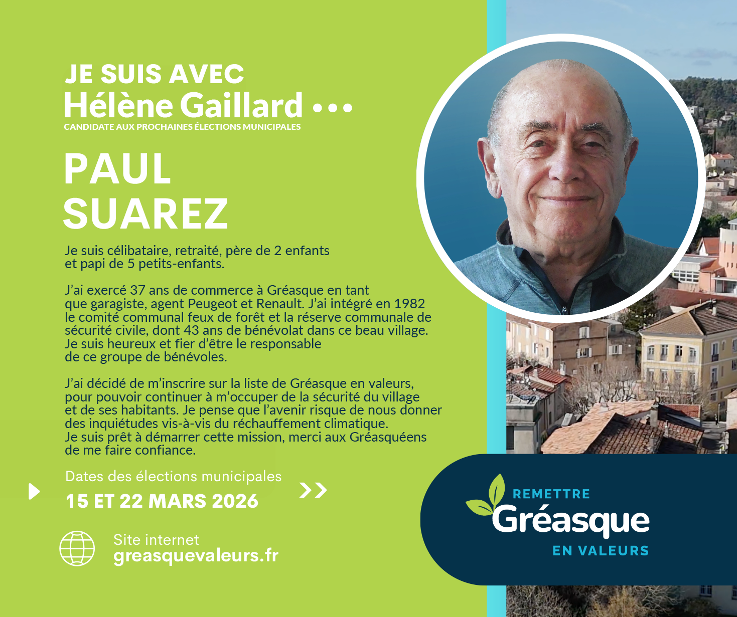 Élu en 1995 sur la liste conduite par Mme Suzanne MAUREL et après mûre réflexion c’est tout naturellement que je m’engage aujourd’hui auprès d’Hélène GAILLARD, séduit par son programme équilibré, sérieux et ambitieux pour les Gréasquéennes et Greasquéens.